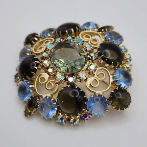 Juliana D&E Blue & Smokey Quartz Glass & AB Rhinestone Filigree Heart Brooch