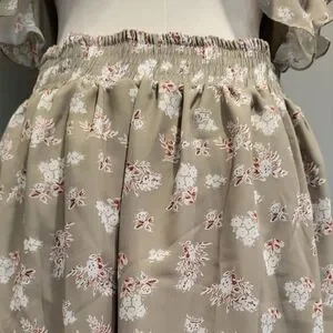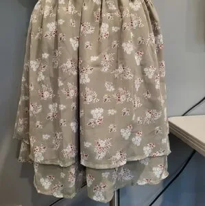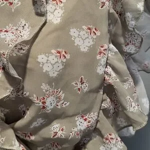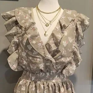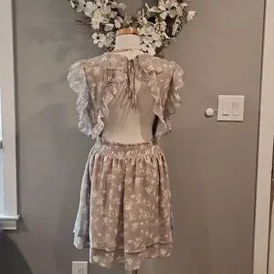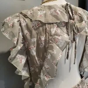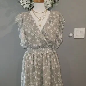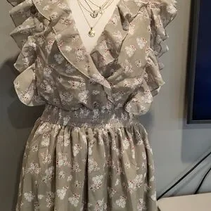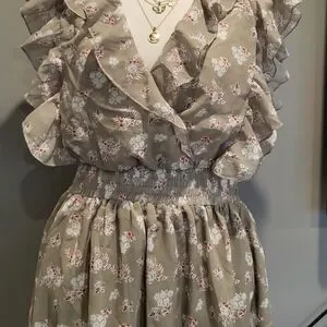 Pretty sage colored fabric with a floral print. Features backless/cut-out style, v-neckline with frill detailing along the bust line and sleeves. Waist has elastic and bottom of dress is flowy with a layered skirt.