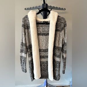 Lety & Me cardigan size medium. Open front design with fur trim. Striped pattern with different shades of gray. EUC