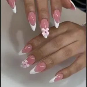 These press-on nails feature a soft pink base with white tips, creating a classic French manicure look. The 3D floral accents add a touch of elegance, making them perfect for any occasion. Enjoy a polished, professional finish with this delicate and feminine design.