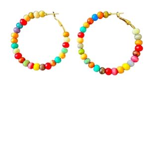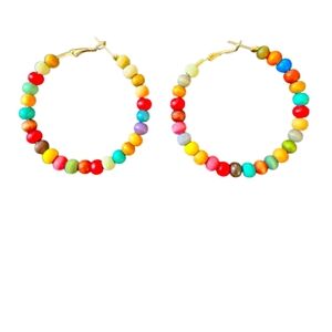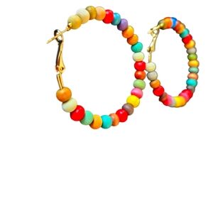 Add a pop of color to your outfit with these vibrant beaded hoop earrings. Beads are made of wood and earrings are lightweight. Tbey have never been worn and are in the original box. Perfect for any occasion.