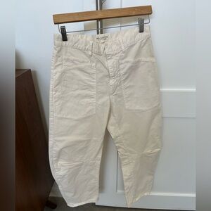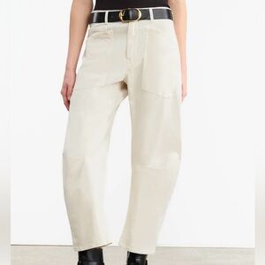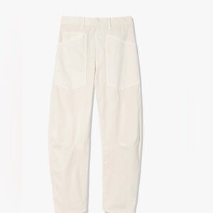 Nili Lotan Women’s Shon Pants in Eggshell. Size 2. Featuring a mid-rise, relaxed fit barrel leg pant in brushed stretch twill cotton. Uniquely curved silhouette. Seam detail at knees. Gusset at inseam. Zip fly. Hidden hook-and-bar closure. Hidden stay button closure. Top-stitched front and back patch pockets. Belt loops. Excellent Condition.