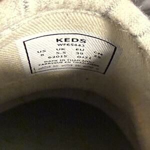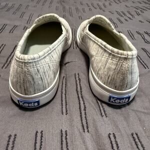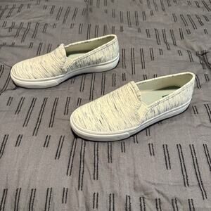 Keds Softerra slip-on sneakers in women’s size 8. Stylish cream marled pattern with cushioned Softerra insoles for all-day comfort. Lightweight fabric upper with elastic goring for easy on and off. Durable rubber soles with wave-pattern tread for traction. Gently worn with minimal signs of wear (see photos). Style WF6S443. Made in Thailand. Perfect for casual wear, travel, errands, or lounging.