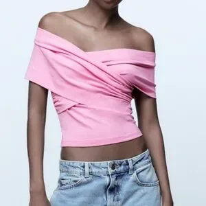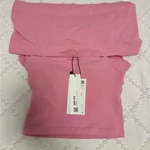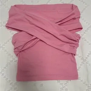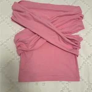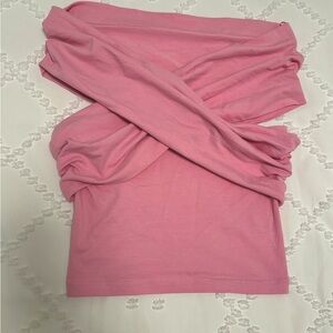Beautiful crossover off the shoulder top in pink size Medium. Brand new with tags. Nice and fitted, and different ways to wear it. Too small for me now but great style
