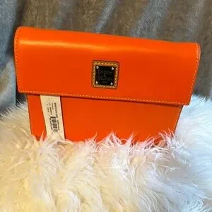 This vibrant orange wristlet clutch from Dooney & Bourke features a sleek, structured design with a fold-over flap closure. The smooth leather finish and metallic logo plate add a touch of elegance, making it a standout accessory for any occasion.