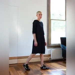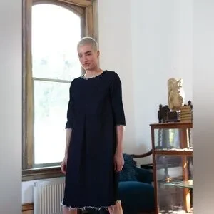 Best-selling A-line stretch denim dress in signature stretch denim. Features 3/4 length sleeves, pockets, and pleated front. Pre-washed to create a raw edge detail at the sleeves, hem, and neckline.
