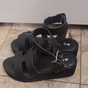 These black sandals feature a chunky platform sole and multiple thick straps in a gladiator-inspired design. The smooth leather material and adjustable ankle strap with buckle closure ensure a comfortable fit, making them ideal for casual or semi-casual wear.