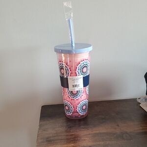 Enjoy your drinks in style with the Vera Bradley Harry Potter collaboration Pink Mandala Tumbler, featuring Luna Lovegood's medallion. This vibrant tumbler features a beautiful pink mandala design. Never used with original packaging.