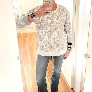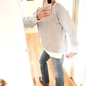 Ivory and grey Crew neck Split hem reversible sweater. Love the versatility allowing for wear on the print side or the solid side and rolling the cuffs to expose the contrasting pattern. Warm and stretchy, this is a fabulous layering piece. In perfect condition, no flaws. No tag.