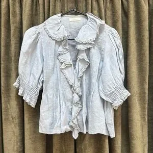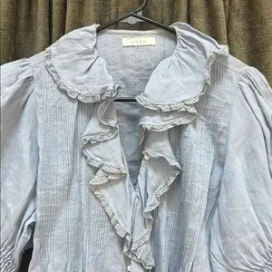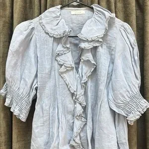 Elegant light blue Doen Henri top with ruffled details, perfect for any occasion. The color is a little richer blue in person.