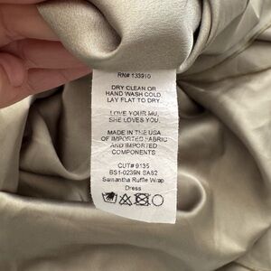 The Samantha Ruffle Wrap Dress is a flirty, romantic mock wrap that gives you the flattering appearance of a wrap with the security of an elastic waist and sash. Ruffled straps cross to a v in both front and back, with a tie to keep them in place. High enough in back for a strapless bra. Show off your shoes with a high-love hemline with a gentle ruffle along the hem that goes all the way up the slit.