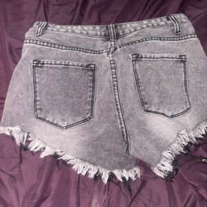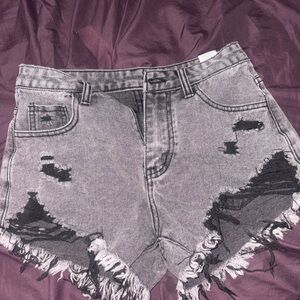 Stylish distressed gray denim shorts perfect for casual outings. These shorts offer a trendy look with their frayed edges and unique design.