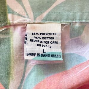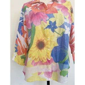 Vintage 90s Floral Photo Print Button Down Blouse. Collared button down blouse with a multicolored floral photo print design. Rhinestone details. 3/4-bracelet length sleeves without button closures. Brand unknown. 65% polyester, 35% cottons. Vintage size large, but please refer to measurements: 47” chest, 44” waist, 17.5” shoulders, 18.5” sleeves, 25” length.