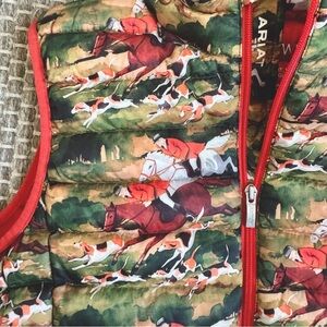 Rare Ariat hunt scene Ideal Down vest. Ladies size large. Features a lively hunt scene with hounds and horses. Perfect for those chilly morning hacks or layering up.