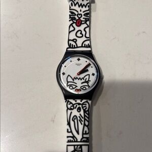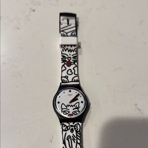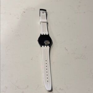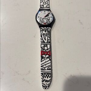 Stylish Swatch wristband with bold black and white graphics. Features red accents for a pop of color. Perfect for a modern look.