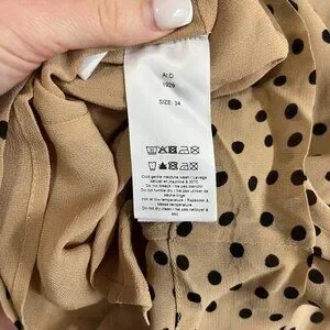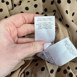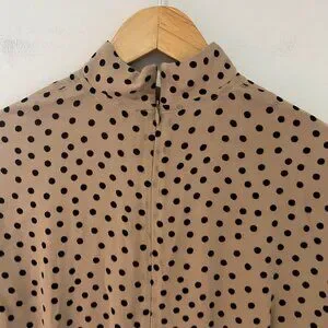 Ganni Brown & Black Polka Dot High Neck Long Sleeve Blouse Size 34. Camel brown with black polka dot print. High mock neck. Back zip closure. Size 34, which is equivalent to US size XS/2. Fully lined. Flowy sleeves.