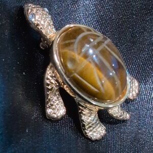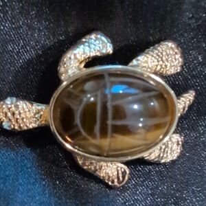 Gold Tone Textured Turtle Brooch Tigers Eye Stone Carved Scarab