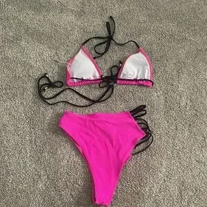 Stylish and vibrant pink bikini set with contrasting black straps. Perfect for a day at the beach or poolside lounging.