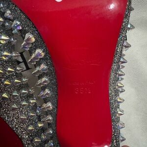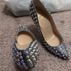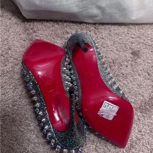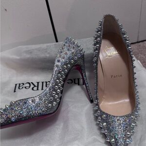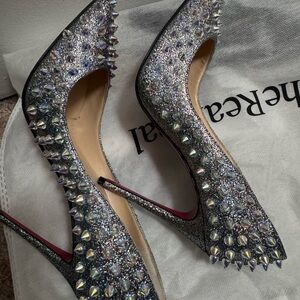 Worn ONCE RARE PERFECT Christian Louboutin Studded Silver & Suede Holographic Heels. I think they are the SoKate style? Very rare I have never seen this before other than on myself. Wore one time for about 20 minutes for an indoor chapel elopement and took them off before I got outside 🤣 Size 35.5, or 5.5 US. I wear 5.5 and they fit perfect. Also comes with dust bag and authenticity is guaranteed, I will send proof upon request for buyer. Poshmark also authenticates purchases over $500. They are in amazing condition. Basically brand new. They sparkle and have a holographic shine to them. Iconic red bottoms in perfect and original condition.