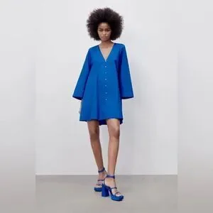 Poplin dress with V-neckline and wide long sleeves. Front gold false buttons.