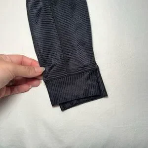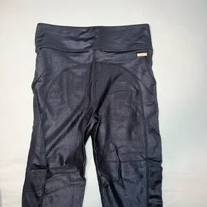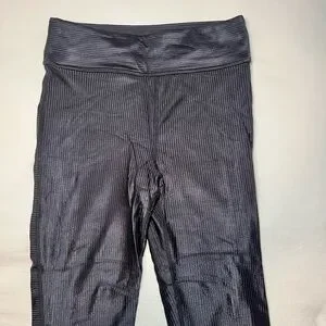 Sleek black sports bra with matching leggings. Ribbed texture. Perfect for workouts. A super cool shine finish on the material, you can see the fit of the leggings in the last photo.