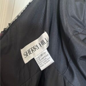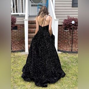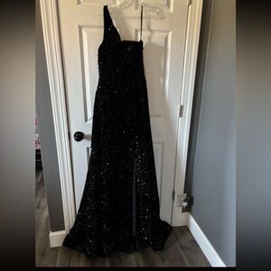 This elegant black gown by Sherri Hill showcases a stunning asymmetrical one-shoulder design adorned with shimmering sequins along with pockets. The high slit adds a dramatic flair, making it an ideal choice for prom. Its luxurious fabric and flowing silhouette ensure a captivating presence.