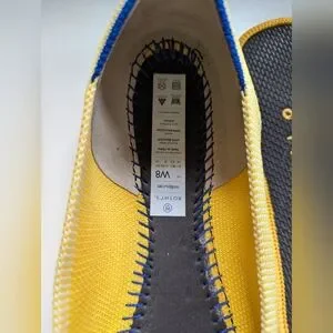 YELLOW & BLUE COLORS Sunshine Yellow, a Vibrant Lemon Hue. Sharp style meets exceptional comfort in this sophisticated silhouette. Knit from Rothy's signature thread (spun from plastic water bottles). yellow upper. Matching yellow insoles and tan outsoles. Features Rothy's signature blue halo.