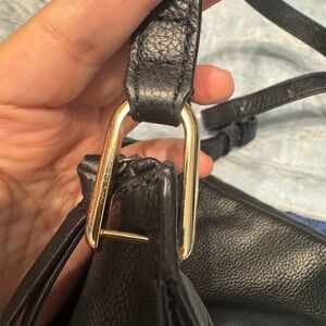 This elegant black crossbody bag features a sleek leather design and gold-toned hardware, offering a sophisticated touch to any outfit. Its structured yet casual shape makes it perfect for everyday use, providing both style and functionality.