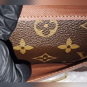 This Louis Vuitton wallet showcases the iconic brown monogram canvas, featuring the signature LV logo and flower motifs. The wallet is elegantly trimmed with tan leather piping, offering a timeless and sophisticated look. Its gold-tone metal push-lock closure adds a touch of luxury to this classic accessory.