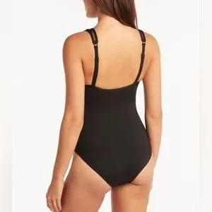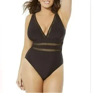 Chic one-piece sleek black plunging v-neck Daci swimsuit with sheer trim & light tummy control. Highlighted by hollowed out mesh crocheted inserts/ladder trim