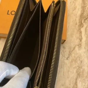 Stylish Louis Vuitton wallet with a classic brown checkered pattern. Features a zip closure.