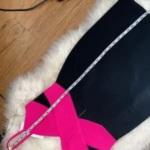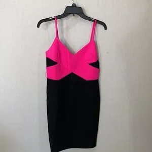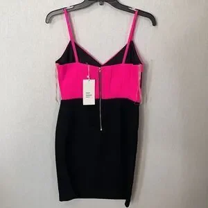 Lucy Paris Women’s Size Small Fuchsia and Black Color Block Mini Dress. Lined. Sleeveless with Spaghetti straps. Sheer panel cutouts. Color block pattern. Stretch Exposed back zipper closure.
