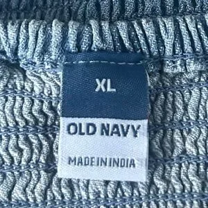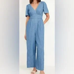 Old Navy Waist-Defined Puff-Sleeve Jumpsuit Denim. 100% cotton. Previously worn and in excellent condition. No rips, tears, spot or other noticeable flaws. Pull up and on jumpsuit. Wide legs and side pockets for comfortability .