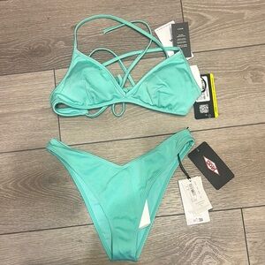RVCA 2 piece bikini size small. New with tags. Solid shimmer teal color. Triangle top and high cut bottom.