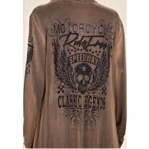 Voice Of California Queen Of The Road Long Duster Light Jacket Open Cardigan S Tan/Brown Black Moto Skull Bling Embellished.