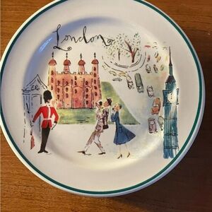 This delightful plate showcases a vibrant London scene, perfect for adding a touch of British charm to your dining experience. The design features a captivating mix of red and blue hues, making it a standout piece in any dinnerware collection. Ideal for both everyday use and special occasions, this plate combines functionality with a whimsical aesthetic.