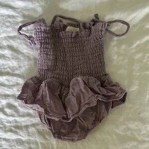 Adorable purple baby romper with ruffled details. Perfect for a cute and comfy look.