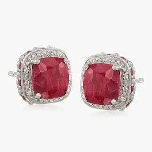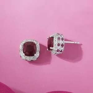 Radiant, genuine, and captivating ruby gemstone studs are a timeless treasure for any jewelry collection and this pair offers more dazzle than meets the eye! A velvety duo of 4.90 ct. t.w. square cushion-cut rubies beam from solid sterling silver settings, with a shimmery halo of .10 ct. t.w. white topaz rounds. A sparkling surprise: a dimensional double frame of .70 ct. t.w. round rubies and more white topaz rounds. These are a celebration of beauty and craftsmanship.