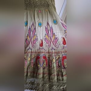 Elegant embroidered skirt in olive and cream. Perfect for adding a touch of bohemian style to your wardrobe.