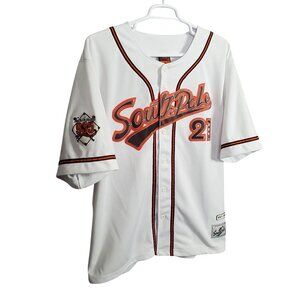 This is a white baseball jersey with orange and brown accents. The jersey features the "Southpole" logo in stylized script across the chest, with the number "21" on the right side. It has a button-down front, short sleeves with striped cuffs, and a curved hem. Additional patches and appliques on sleeves and hem