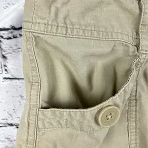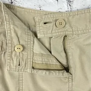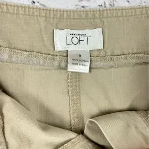Ann Taylor LOFT flare khaki skirt. Lightweight 100% cotton fabric. Two button/zip fly. Front pockets with decorative button accents. Belt loops.