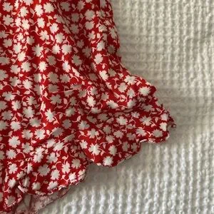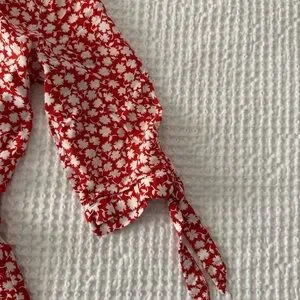 Chic red floral wrap romper with tie sleeves. Perfect for any occasion.
