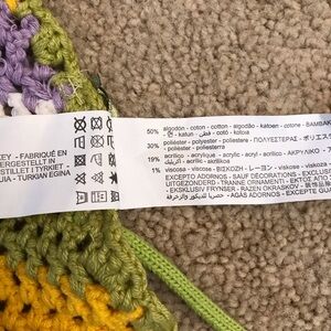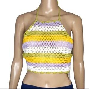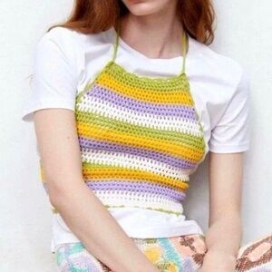 Vibrant crochet halter top featuring stripes of yellow, white, green and purple. Perfect for a stylish summer look.