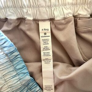 Stylish and comfortable women's Lululemon shorts in a tie-dye blend of blue and white. Sz 4 Reg. Perfect for casual outings and active days. Fabric body is 94% Nylon and 6% Elastane. Inseam 2”. ***tiny stain on backside left cheek. See pics***