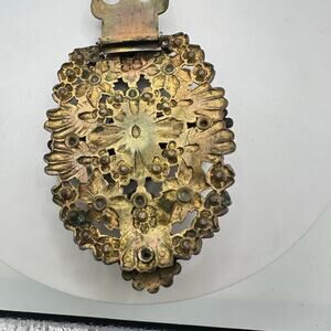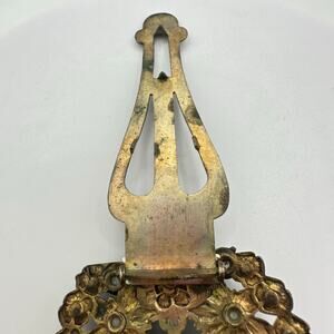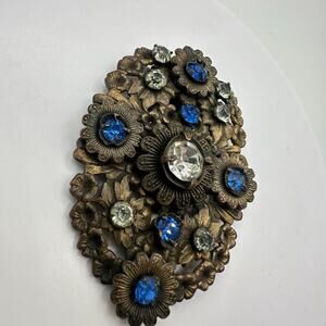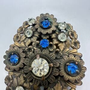 Great condition, there is a small area of verdigris degree buildup to brass and a couple of the oversized rhinestone settings are bent/misshapen however all of the stones are perfectly secure. Clip functions perfectly. Please see photos for measurements in inches.