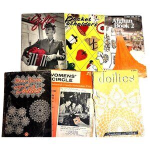 This vintage lot features crochet and craft booklets from the mid-20th century, showcasing intricate designs including doilies, afghans, and gift ideas. A nostalgic collection for crafters or collectors.