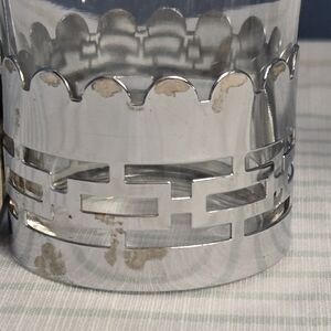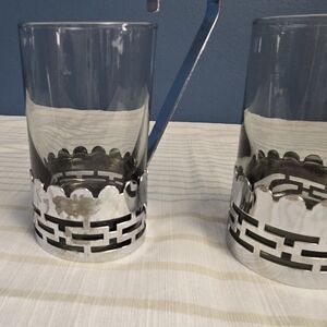 Elevate your coffee and tea experience with these 4 vintage Libbey Federal Glasses. The glasses are made of clear and durable glass material and 2 feature a silver rim. Each glass comes with a removable chrome handle that adds a touch of elegance to your drinkware collection.