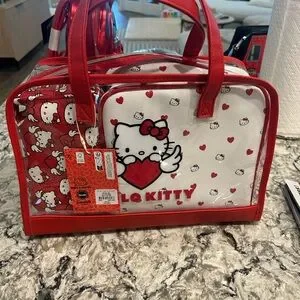 Adorable Brand NWT Primark Hello Kitty Cosmetic bag set. A vibrant red and white. Features a cute Hello Kitty design with heart patterns. Ideal for fans and collectors.