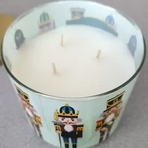 Festive candle featuring nutcracker design. Gold lid adds elegance.