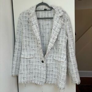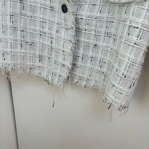 This listing features a SHEIN black and white tweed blazer in size small. The blazer boasts a stylish checkered pattern with frayed hems, offering a contemporary twist on a classic design. It includes a single-button closure and functional front pockets for both style and practicality. Perfect for elevating casual outfits or completing a polished workwear look. For exact condition details, refer to the photos provided.